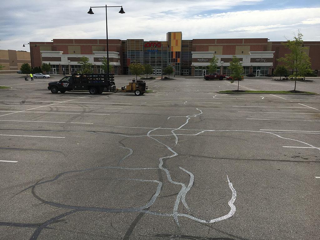 Crack Filling is an essential application for long term pavement protection. Damage to asphalt can occur with water intrusion through cracks in the asphalt and can greatly reduce the life of pavement. While it's impossible to fill every crack on a lot, we suggest filling major cracks 1/8" to 1/2" wide.
