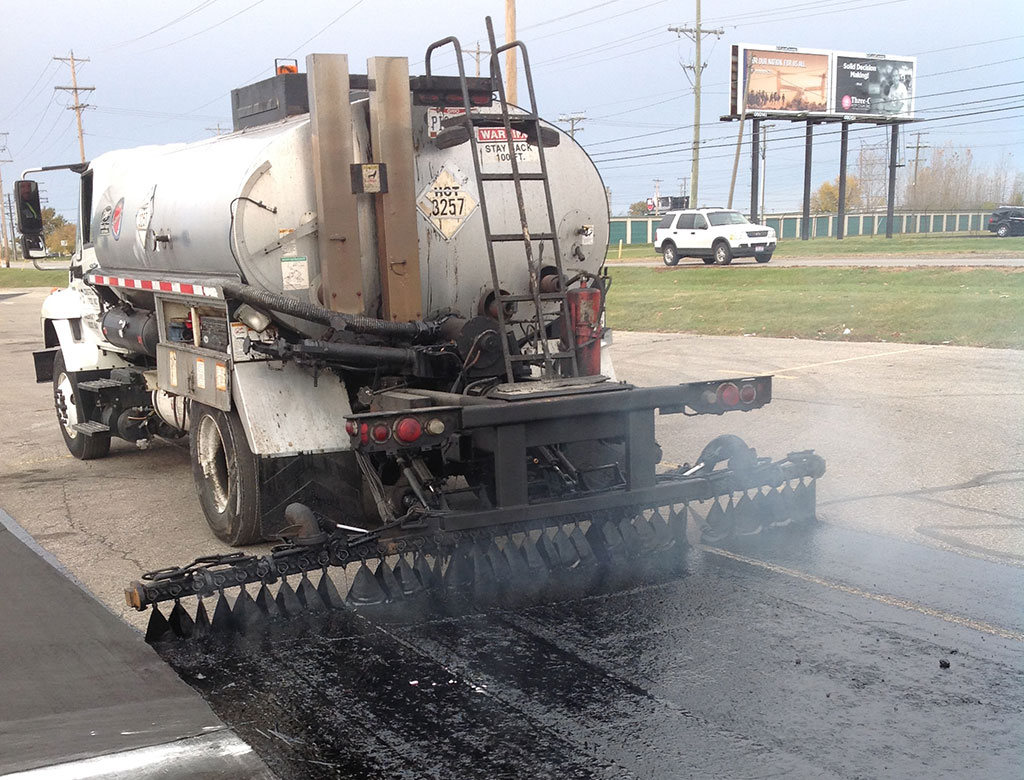 Distributor truck spraying liquid AC to bond Petromat to the surface.